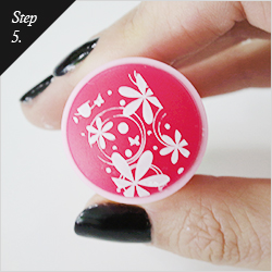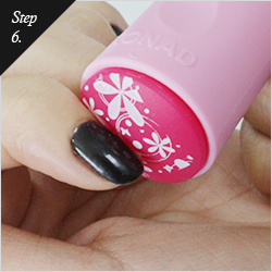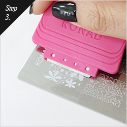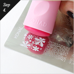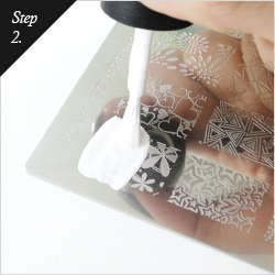 ![]() スタンピングネイル専用ポリッシュをイメージプレートの絵柄の上に塗ります。 Point:多めにポリッシュをのせ、絵柄を隠すように全面に塗ります。 |