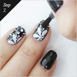 仕上げにスタンピングネイル専用トップコートを塗ります。 Point:トップコートは爪を2、3の面に分けて面ごとに1回ずつ素早く塗るとよりキレイに仕上げることができます。 |
