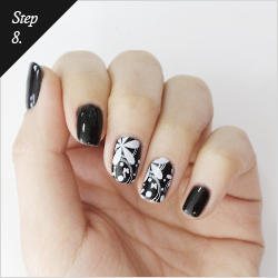 ![]() 綺麗なスタンピングネイルの完成です。 Point:使用後、イメージプレートとスタンプ、スクレーパーについたポリッシュは、専用除光液(ストロベリーネイルリムーバー)をコットンにとり、拭いてください。 |