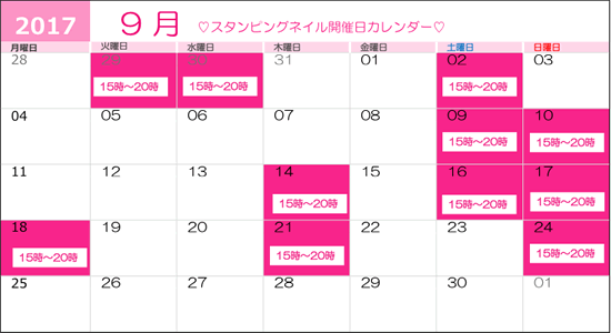 日程:9/2(土)、9(土)、10(日)、14(木)、16(土)、17(日)、18(月)、21(木)、24(土)